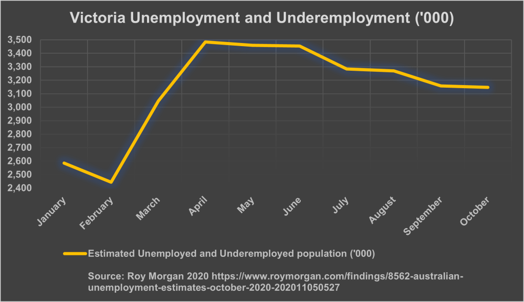 The average wait (of those with a reported waiting time) as of 30 June 2020 was more than 20 months. However VOHA has significant concerns about the backlog of care caused by the pandemic and it can be assumed that there are now many more people on the waiting lists, as well as more (recently unemployed) Victorians eligible for care. The below graph shows the estimated underemployed and unemployed population of Victoria, those of which are likely to be eligible for public dental services.